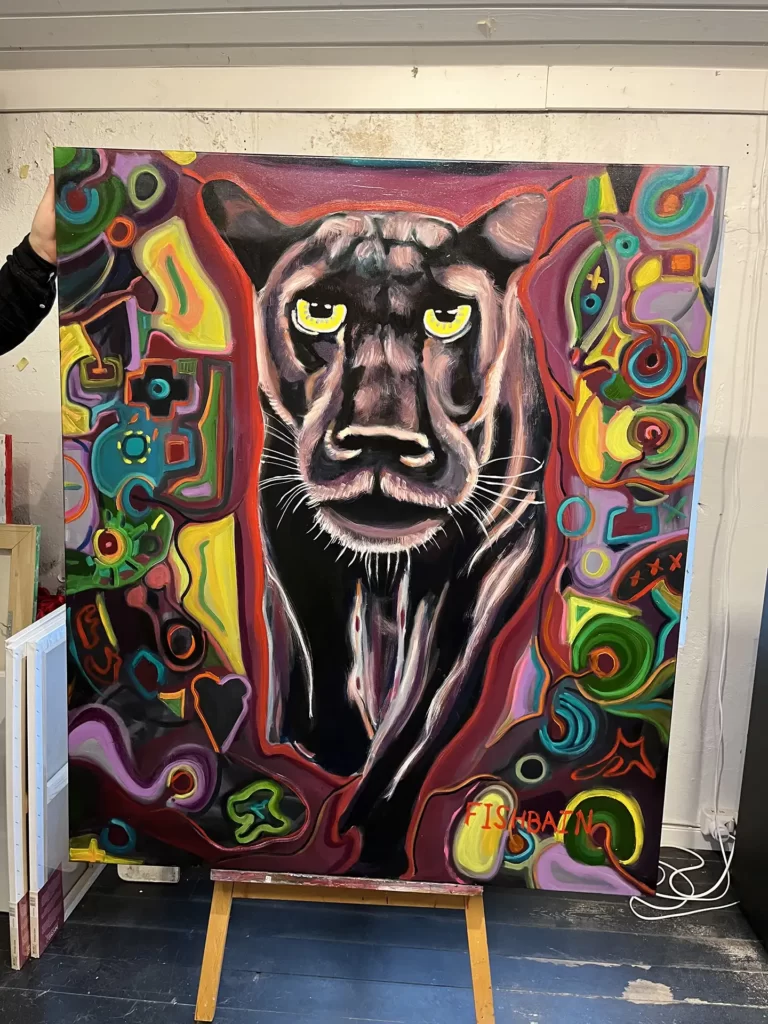 PantherTitlePantherDimensions140x120cmMaterialsOil on canvasDetailsSigned by FishbainPurchace paintingContact me trough WhatsApp or E-mail to purchace this painting. In the E-mail, please specify title of the painting, and which adress its going to be sent to.WhatsAppOrE-Mail
